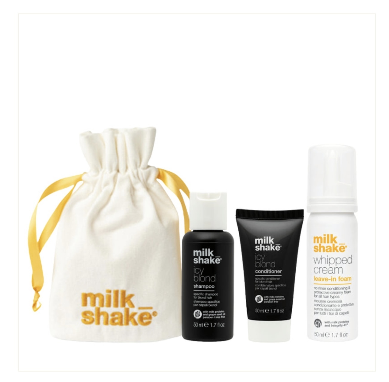 This travel set includes Icy Blond Shampoo, Conditioner and Whipped Cream, working together to neutralise warm undertones while enhancing shine and softness. The black pigment counteracts yellow or orange tones in blond or lightened hair, giving ash tones. It brightens and protects blonde, silver and white hair from fading. Packed in a chic reusable pouch.