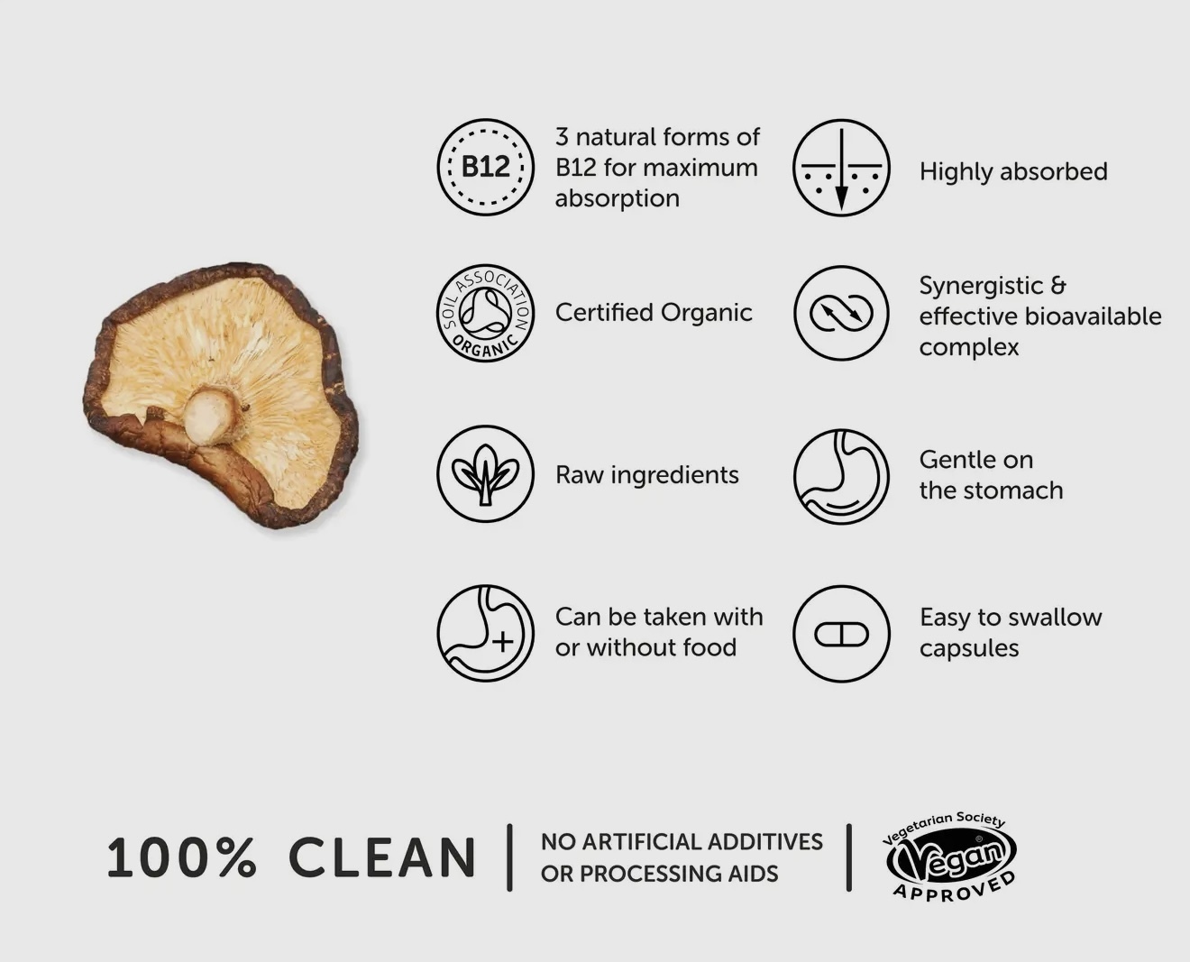 This essential supplement is made from organic shiitake & oyster mushrooms, with 3 natural forms of vitamin B12, it's sourced from wholefoods so is more easily digested and absorbed by the body. Plus it benefits from many cofactors such as polysaccharides, folate, selenium and iodine.