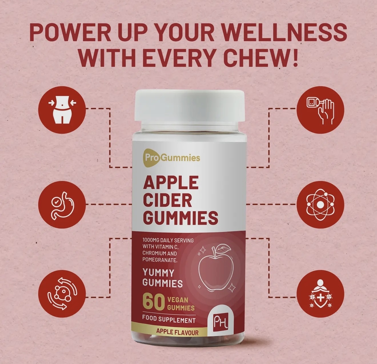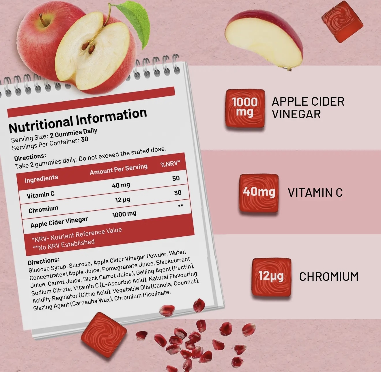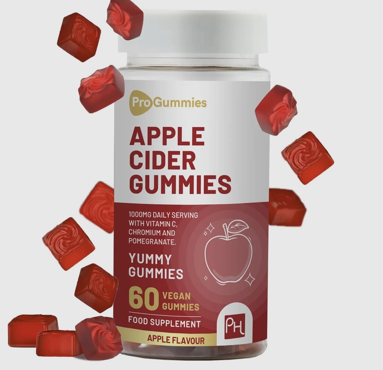 Infused with the natural power of apple cider vinegar the apple flavoured gummies are specially formulated to boost your metabolism and help manage weight by keeping cravings at bay and helping you feel fuller for longer. Also added chromium to keep your glucose levels in check and antioxidant packed pomegranate and vitamin C which improves your immune function, reducing inflammation and give your skin a healthy glow.