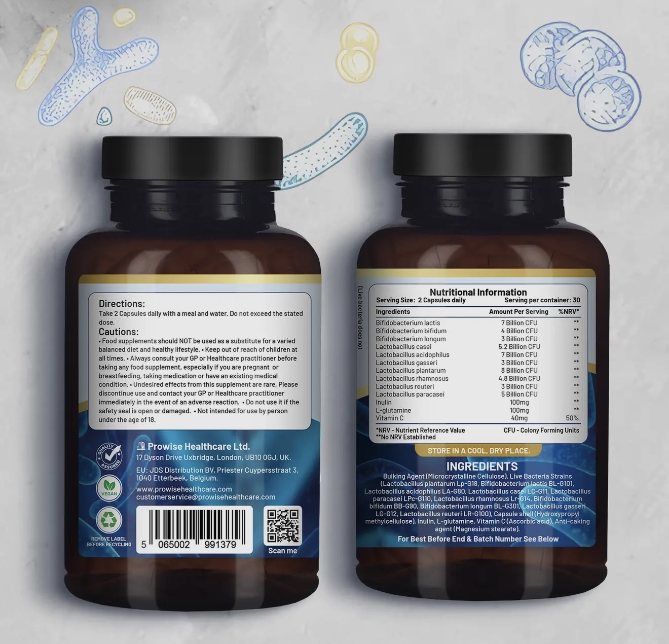Revitalise your gut flora, supports digestion well-being. The vegan probiotic supplement effortlessly unlocks optimal gut health, promoting digestive ease and comfort. Enriched with inulin, vitamin C and L-glutamine which allow probiotic cultures to survive stomach acidity and reach the gut for maximum effectiveness.